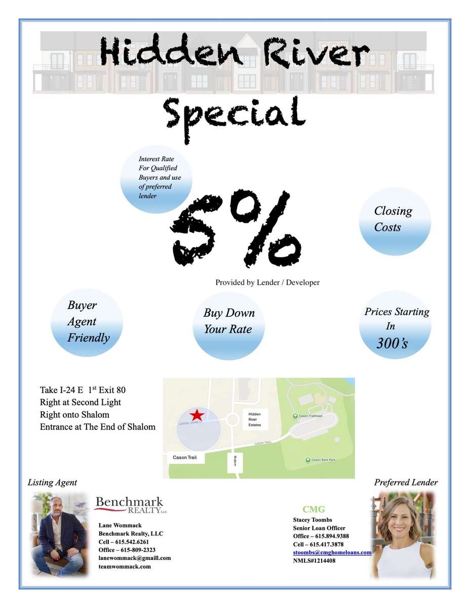From I-24E, Take Exit 80 south, rgt at second light, rgt at end of road onto Shalom, Drive until you cross Cason Trail, Townhome on Right. Model Home at 1913 Judson Johns Dr.