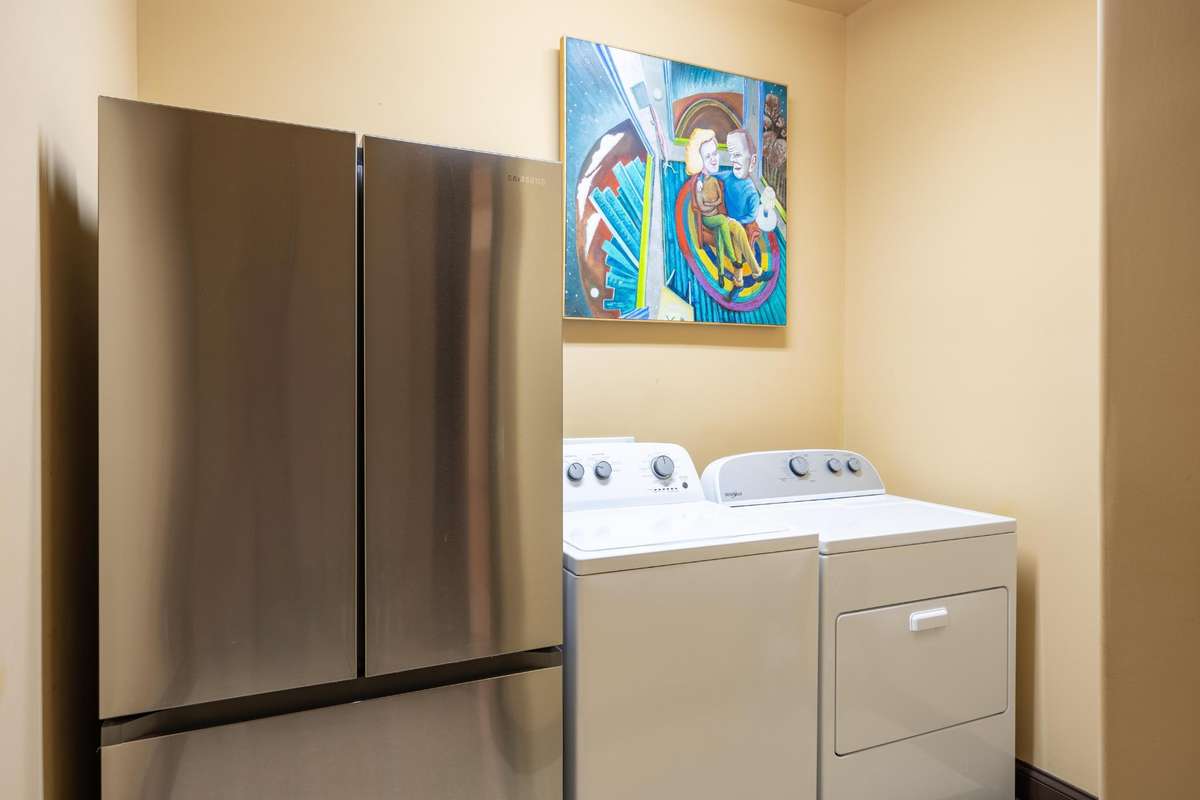 The fully finished terrace level is built for entertainment and comfort, showcasing a private theater room with custom blue- light hand- painted ceiling, a spacious entertainment den with wet bar and wine chillers, a home gym, a second office, a fifth bedroom with en- suite bath, and an additional laundry room.
