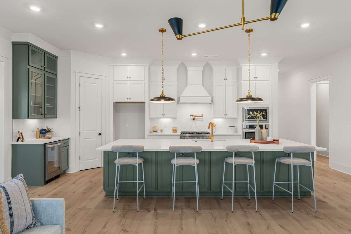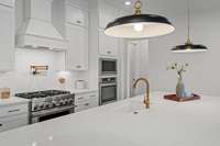 The gourmet kitchen is a true showpiece, outfitted with a 36" gas range, double ovens ( including a built- in wall oven) , a pot filler, wine/ beverage fridge, and an oversized island that anchors the space with style and function. Designer lighting fixtures and upscale finishes are found throughout, elevating every room with curated luxury.