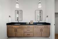 The main- level primary suite is a true retreat, with a glamour bath featuring a freestanding soaking tub, fully tiled shower, dual vanities, and elegant tile selections that feel like a spa. Upstairs offers a spacious loft, three additional bedrooms, and two full baths, providing ideal separation of space for family or guests.