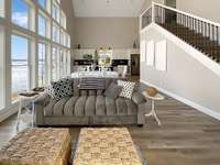 The house boasts four bedrooms and three full bathrs, complemented by an open floor plan with vaulted ceilings that enhance the sense of space and luxury. Imagine waking up to the gentle sounds of the water and starting your day in a sun- drenched, lakeside great room that features walls of windows overlooking the tranquil lake.