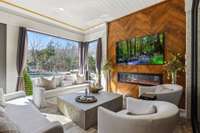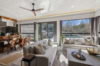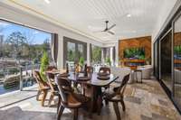 Three season patio with full outdoor kitchen, dining, seating area, media, heated floors, motorized full screens, motorized clear shades!