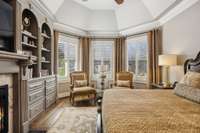 The home is finished with decorative moldings, crown moldings and built- ins, creating an atmosphere of luxury and charm. Exposed brick accents and a curved staircase add character, while floor- to- ceiling and bay windows with elegant window treatments provide abundant natural light with eastern front/ western rear exposure.