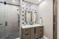 As you enter through the monumental metal entrance, you are greeted by high ceilings in the foyer and living area, setting the tone for the sophistication that awaits. The home includes four spacious bedrooms and 5/ 2 beautifully appointed bathrooms, ensuring ample space for family and guests. The primary main floor ensuite bathroom is a sanctuary of relaxation, featuring a separate two person shower, soaking tub, heated floors and separate vanities, along with spacious custom closets.