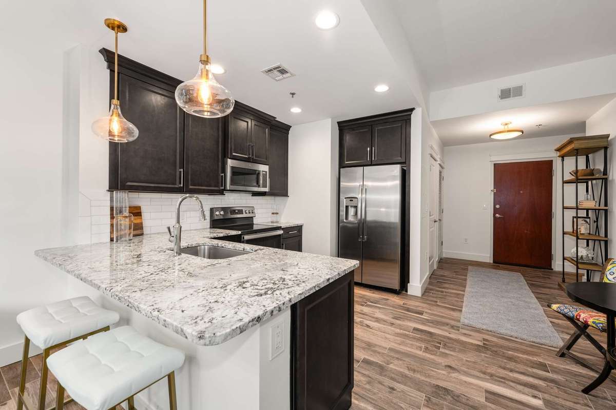 Find your perfect city home here in this fully renovated two bedroom! Updates include all new cabinetry and countertops in kitchen and baths, new flooring, lighting, plumbing, and paint throughout. Heated tile floors in both bathrooms, in- wall AV speakers in living space, and marble tiled primary shower.