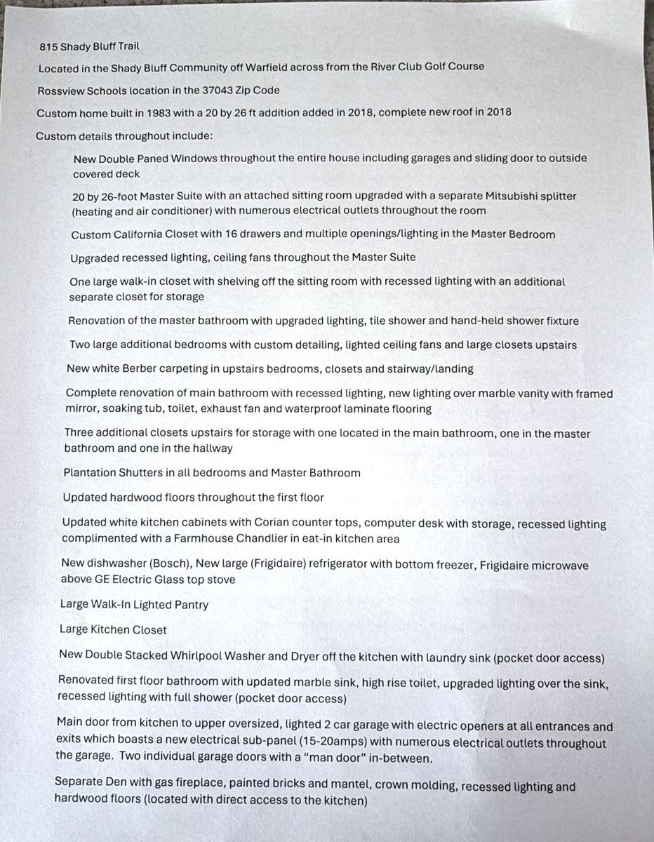 Marvelous family/ executive home ( in the Shady Bluff Community) is across Warfield Drive from the River Club Golf Course. Two additional golf courses are within 1 mile. The wooded neighborhood is nestled over the Red River where trees and wildlife abound within the heart of the city. This is a forever home neighborhood with No HOA. . Shopping and top rated schools are near.