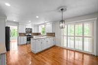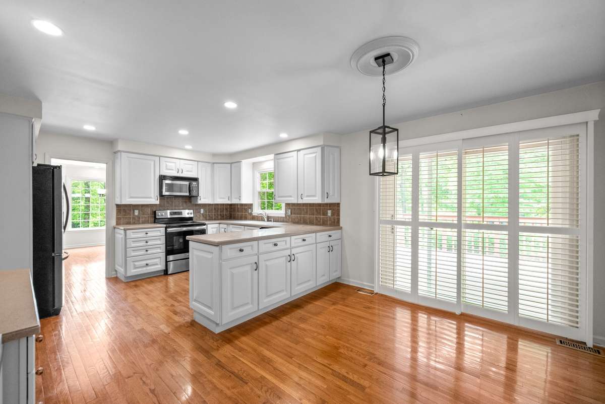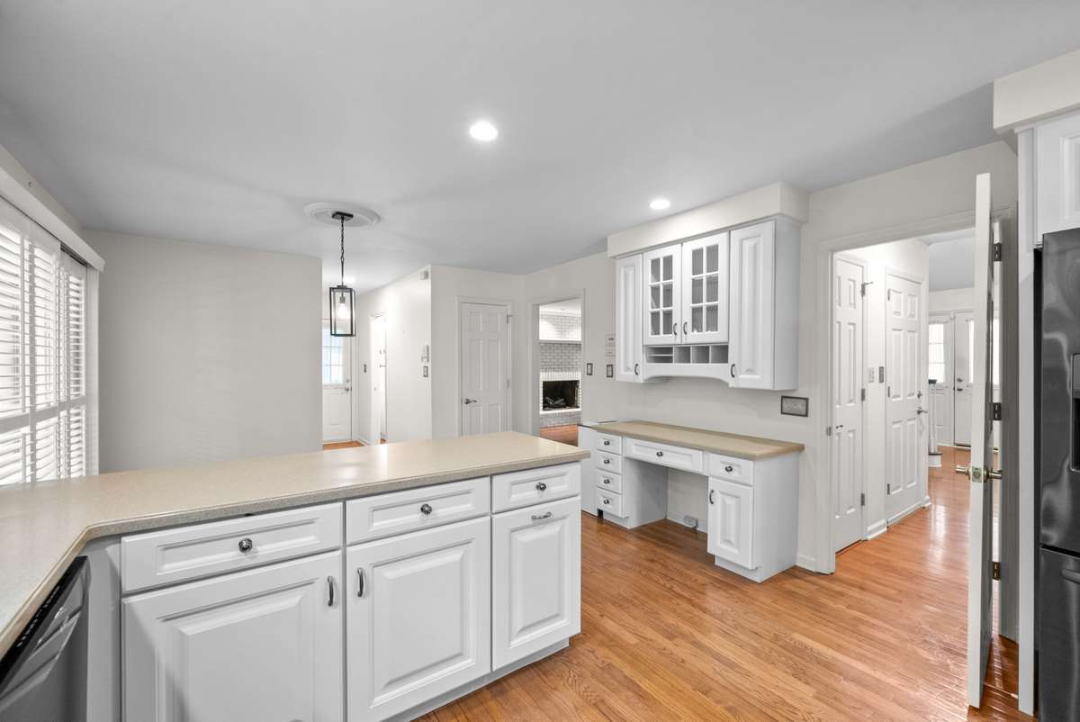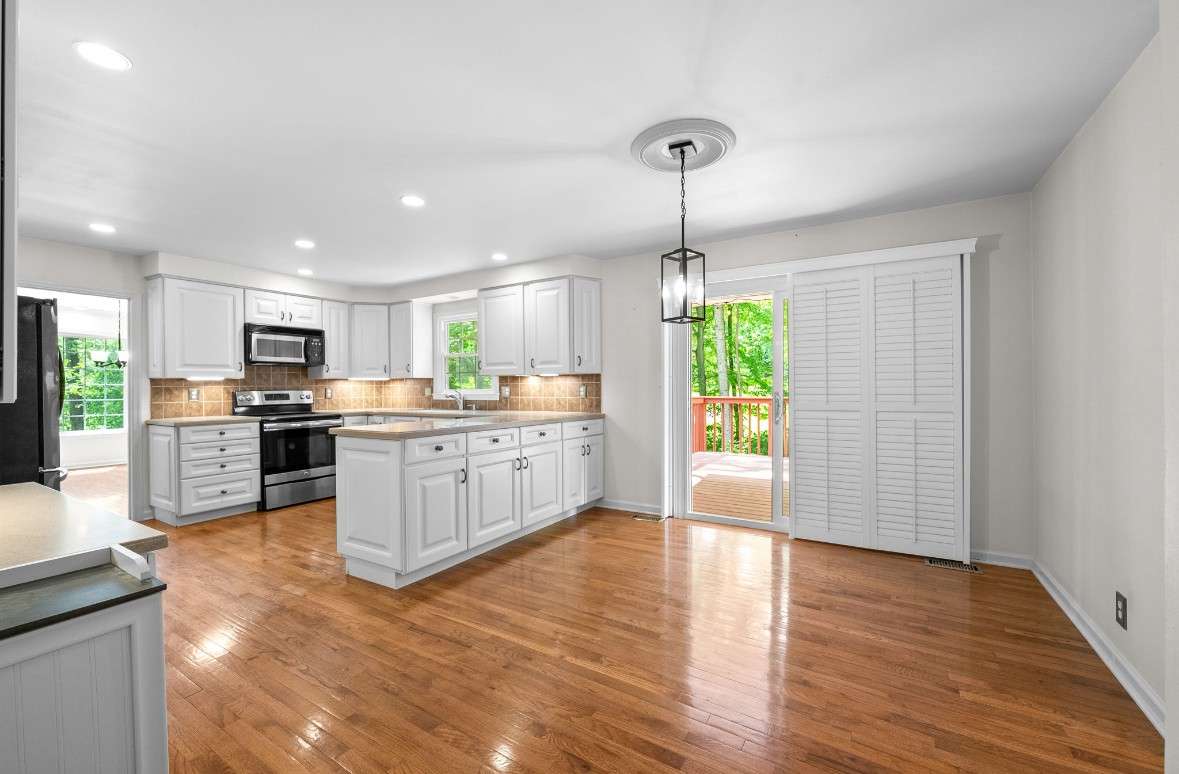 living room with gas fireplace, family room, dining room with oversized bay window, large kitchen, covered deck, laundry room and bath at entrance into double vehicle garage with man door and 2 garage doors. Extra workspace is in garage.