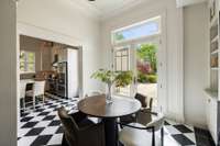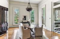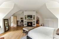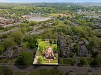 Inside, nearly 14- foot ceilings, five fireplaces, original hardwood floors, and exquisite period lighting showcase the home’s enduring character. The gourmet kitchen balances old- world craftsmanship with modern luxury, featuring marble countertops, Viking appliances, and floor- to- ceiling custom cabinetry.