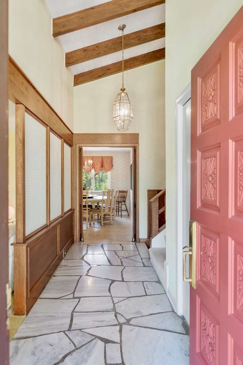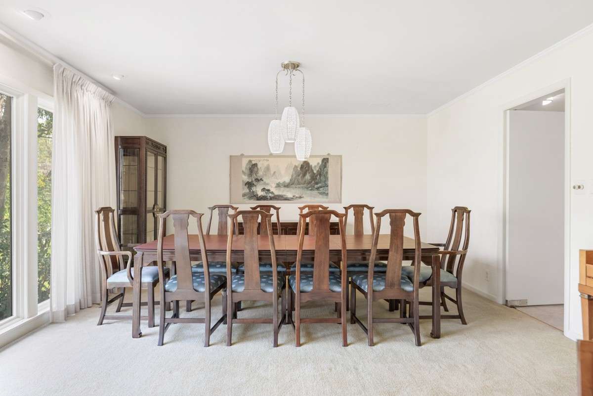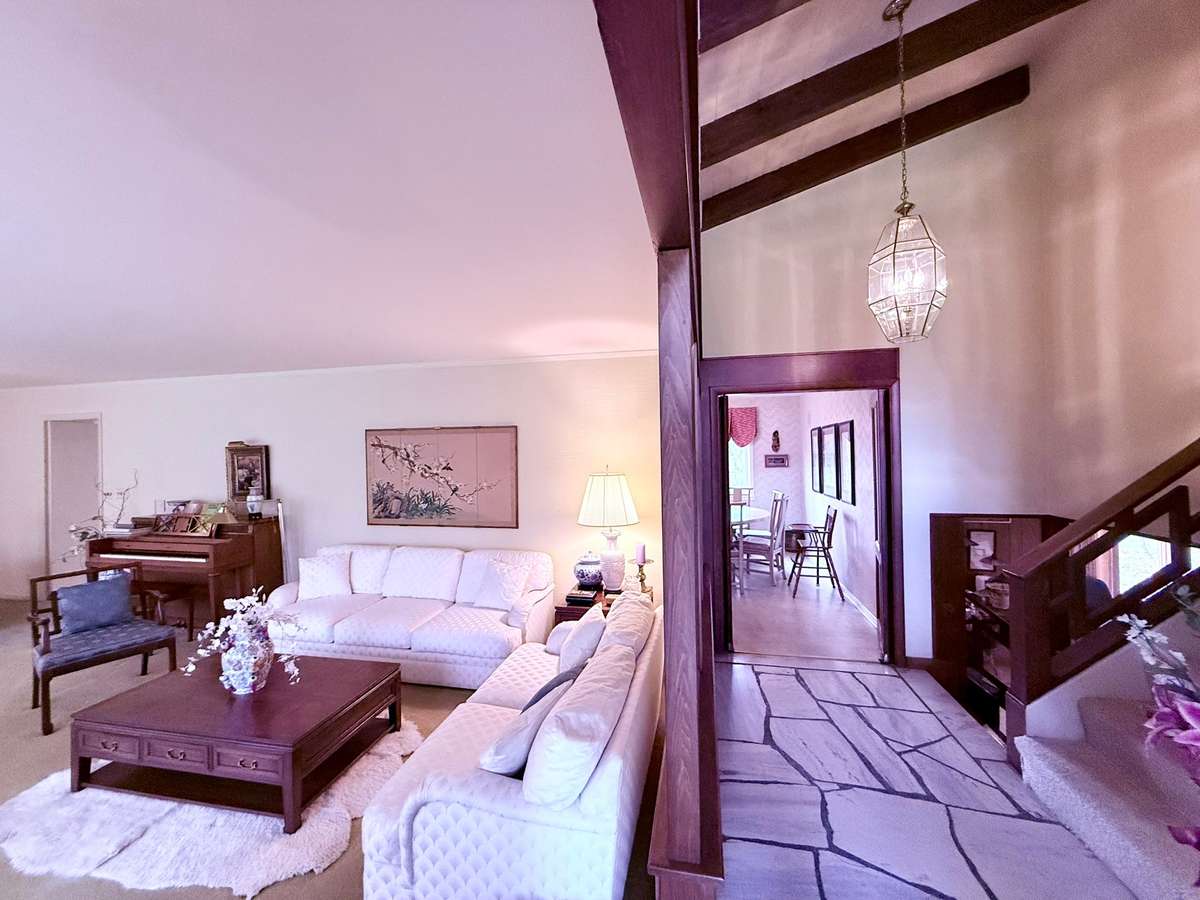 On entering the front foyer, one is welcomed by marble flooring, a high, natural wood beamed ceiling and custom- built Asian screening. The main entry level features combination living room and dining area as well as a large kitchen and dinette, with adjacent pantry and hobby or sewing room.