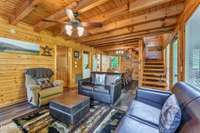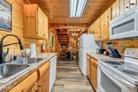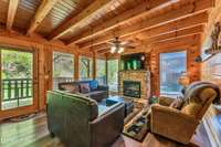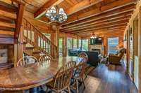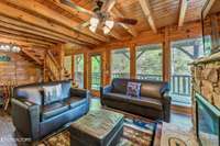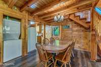 This charming 2 bed, 2 bath log cabin in the heart of Pigeon Forge offers 1, 664 sqft of classic cabin charm and modern comfort. An ideal short- term rental or mountain retreat. The open living and dining area features soaring wooden beam ceilings, a cozy fireplace, and an abundance of windows that fill the space with natural light. The kitchen carries the rustic aesthetic with wooden cabinetry and a warm, welcoming atmosphere.