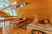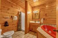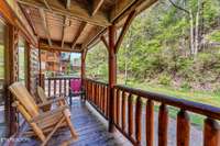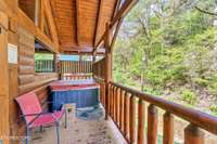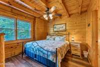 Both bedrooms are generously sized, and the two bathrooms include unique features; one boasting a red heart- shaped jetted tub and walk- in shower. The loft area provides extra sleeping space, perfect for accommodating guests. Step outside to unwind on either of the two covered porches overlooking a peaceful creek- one with a private hot tub, perfect for soaking after a day in the Smokies.