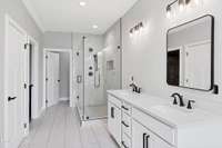 The heart of the home is the gourmet kitchen, boasting quartz countertops, custom cabinetry, and top- of- the- line stainless steel appliances. The open layout flows into the living area, highlighted by a cozy gas fireplace and soaring 20- foot ceilings, creating an inviting atmosphere for gatherings.