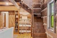 Further up the hill at the top of the property, there is a small “writers” cabin with a beautiful view of nature at its best. It has a kitchen, bathroom and living area on the main level, and a loft bedroom on the second level. This cabin is patiently waiting on a new caretaker to write its next chapter in history.