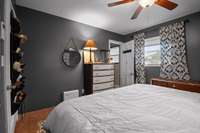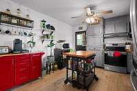 Inside, you' ll find three spacious bedrooms and two full bathrooms. The renovated kitchen features butcher block countertops, stainless steel appliances, a modern tile backsplash, and durable LVP flooring. The primary suite includes a custom tile shower, while the guest bathroom showcases designer tile accents. Original hardwood floors run throughout much of the main level, adding warmth and character.