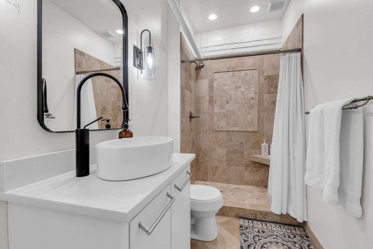 The updated kitchen is a chef' s dream with brand- new countertops, stainless steel appliances, Sub- Zero refrigerator, and a built- in bar fridge—perfect for entertaining or enjoying a quiet night in. Both bathrooms have also been refreshed with new countertops, continuing the sleek, contemporary aesthetic throughout the home.
