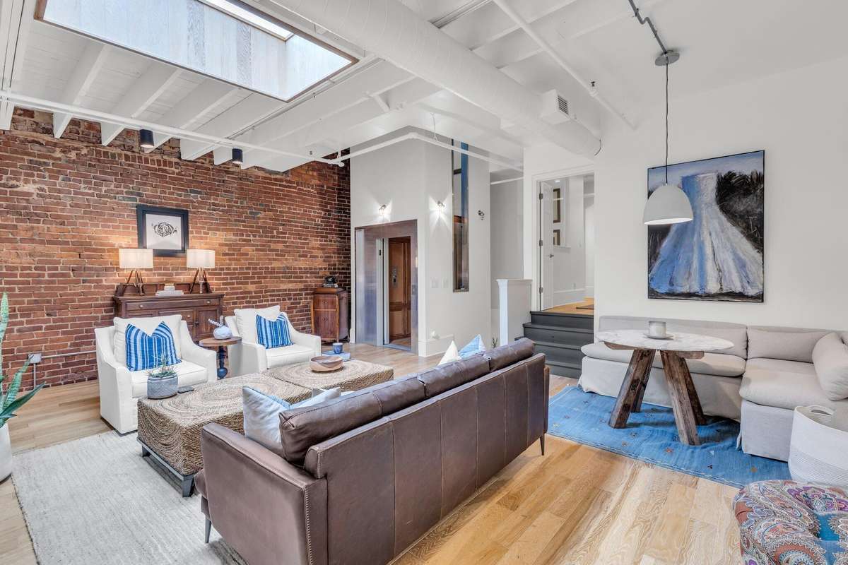 The main living area welcomes you with soaring ceilings, exposed brick walls, and a gas log fireplace, offering warmth and character from the moment you step inside. A skylight above the living room floods the space with natural light, enhancing the open, airy feel. Freshly painted throughout, the home features a clean, modern palette that complements the original architecture.