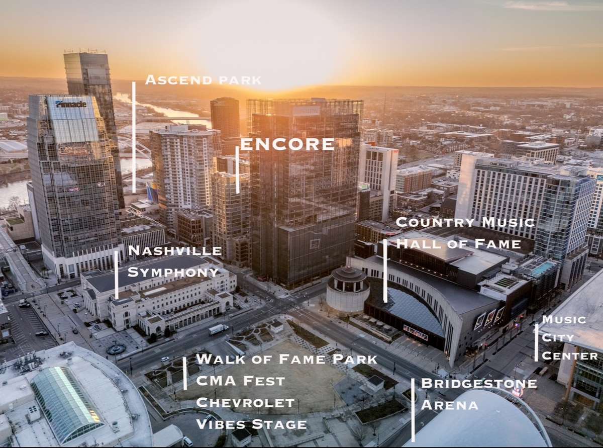 From Broadway, turn right onto Third Avenue, South. Encore is located on the corner of Third and Demonbreun. Parking garage is located on third across from DGX.