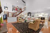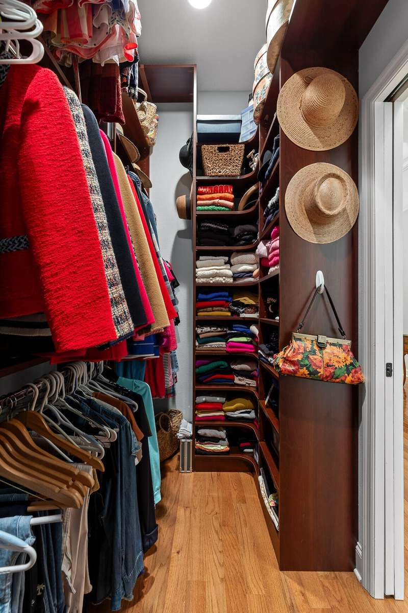 The main- level master suite is a private retreat, offering a luxurious walk- in shower, soaking tub, and custom- designed walk- in closet for exceptional storage. Adjacent to the master, a private office/ library provides a peaceful space for work or relaxation.