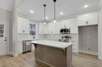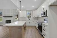 Step inside to a bright and inviting interior featuring an open floor plan, modern finishes, and ample natural light. The kitchen is both functional and stylish, complete with stainless steel appliances, plenty of cabinetry, and a large island perfect for casual meals or entertaining guests. The adjoining dining and living areas provide a seamless flow for everyday living.
