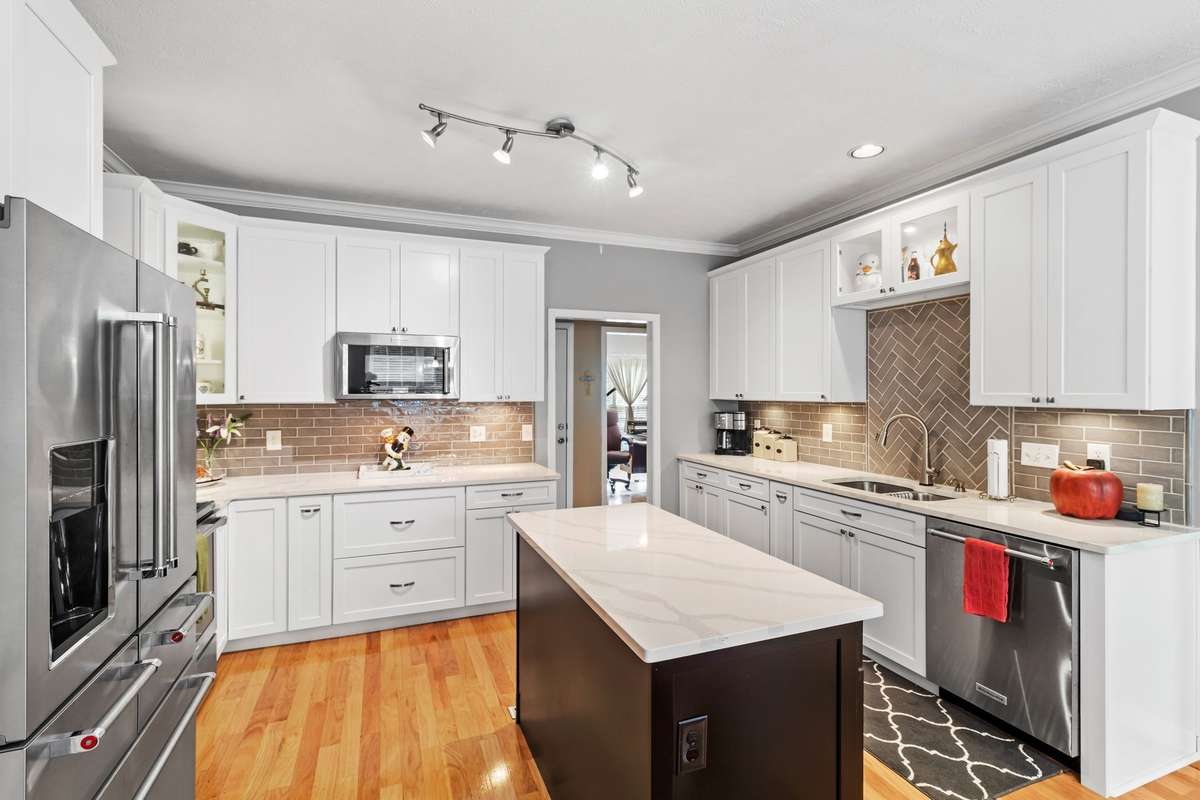 Beautifully Updated 4- Bedroom Brick Home on . 39 acre lot in Sought- After McFarlin Pointe! This stunning home offers an open, functional layout and numerous high- end upgrades. The remodeled kitchen features brand- new soft- close cabinets, striking quartz countertops, an island, ss range hood and a stylish tile backsplash. The renovated primary bath boasts a spa- inspired tiled shower, freestanding tub, and new cabinetry. Hardwood floors flow through the main living areas and primary suite, with new carpet in all secondary bedrooms and the large bonus room. Ideal for multi- generational living, the main level includes two bedrooms and two full baths. Upstairs, you' ll find two spacious bedrooms with a Jack and Jill bath. Enjoy outdoor living on the expansive deck with aluminum railings, overlooking a private, wooded backyard. Additional highlights include a formal dining room with wainscoting, a tray ceiling in the primary bedroom, and a storage shed that remains with the property.