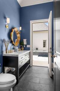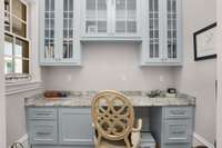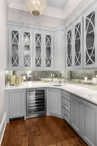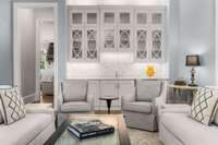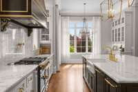 Inside, the chef’s kitchen is a culinary dream, boasting a La Cornue oven, dual dishwashers, double refrigerator, and a drawer- style microwave. A spacious working pantry includes a steam oven and warming drawers. The home also features two butler’s pantries—one off the kitchen with a wine refrigerator and ice maker, and another in the main living area with a sink and beverage fridge.