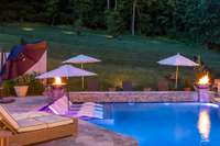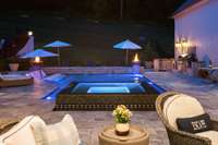 The outdoor living space is a true oasis, featuring a covered lounge area with a fireplace, a sparkling pool, a hot tub, an additional outdoor fireplace, and a fully equipped outdoor kitchen with a sink, refrigerator, gas grill, and smoker—perfect for entertaining.