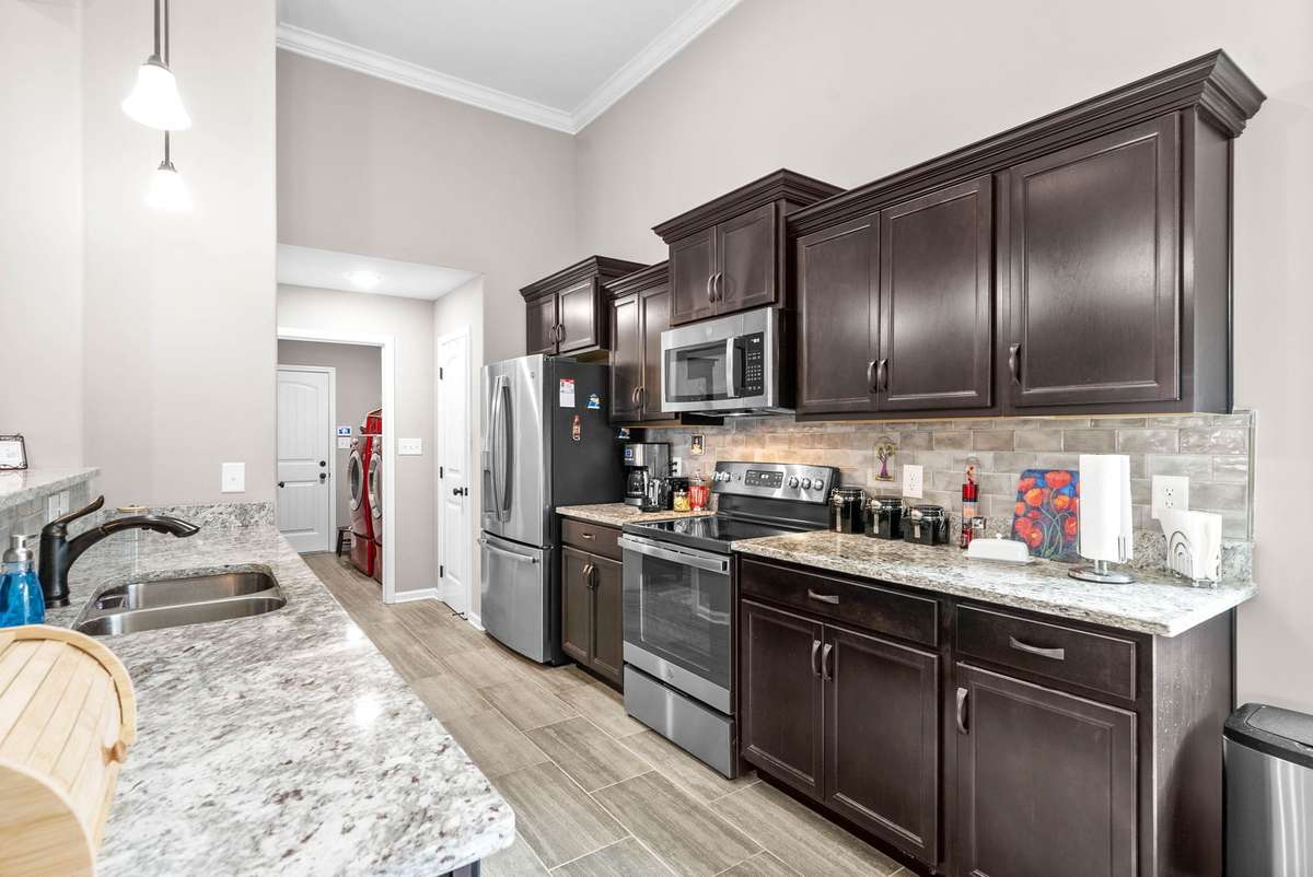 Use preferred lender, and receive up to 1% of your loan amount as a lender credit towards closing costs or 1 year temporary buydown. Buyers choice. Step into comfort and style with this beautifully designed home at the end of the street. The open- concept kitchen is both functional and stunning, showcasing upgraded cabinetry, granite countertops, and a classic tile backsplash. Just off the kitchen, the expansive great room offers a warm and welcoming atmosphere with its soaring ceilings and a striking stone gas fireplace. The spacious primary suite features a large walk- in closet, a relaxing garden tub, and a fully tiled walk- in shower. Entertain with ease in the open formal dining room, or retreat to the oversized bonus room—perfect for a home office, playroom, or media space. Thoughtful details throughout include custom trim work, rich wood and tile flooring, and a generous laundry room for added convenience. Enjoy endless hot water with a tankless gas water heater, and unwind on the large covered deck—ideal for relaxing evenings or weekend gatherings. Leaf Filter installed gutter filters that have a transferrable lifetime warranty!