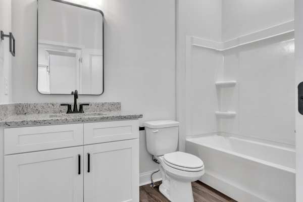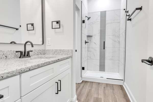Full bathroom on the 2nd floor with modern decor, fixtures & lighting to serve guest bedroom and living area guests.