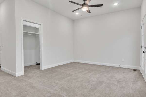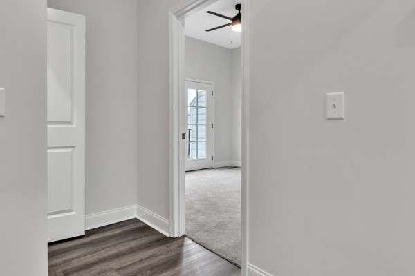 A shot back toward the entry and owner's closet featuring beautiful lighting and a modern fan & light.