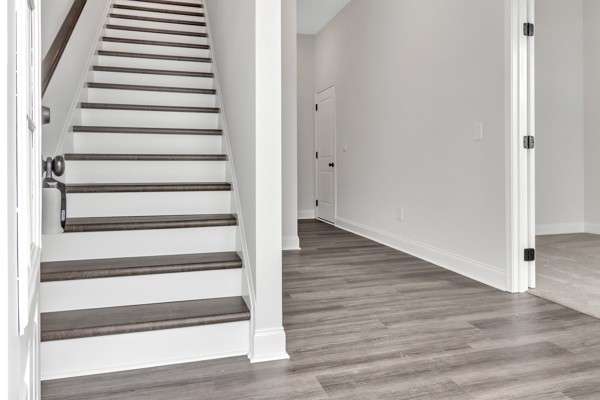 Stained hard wood stairway to the 3rd floor to the owner’s retreat, laundry room and 2nd guest room.