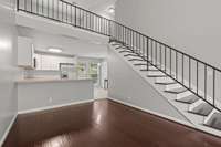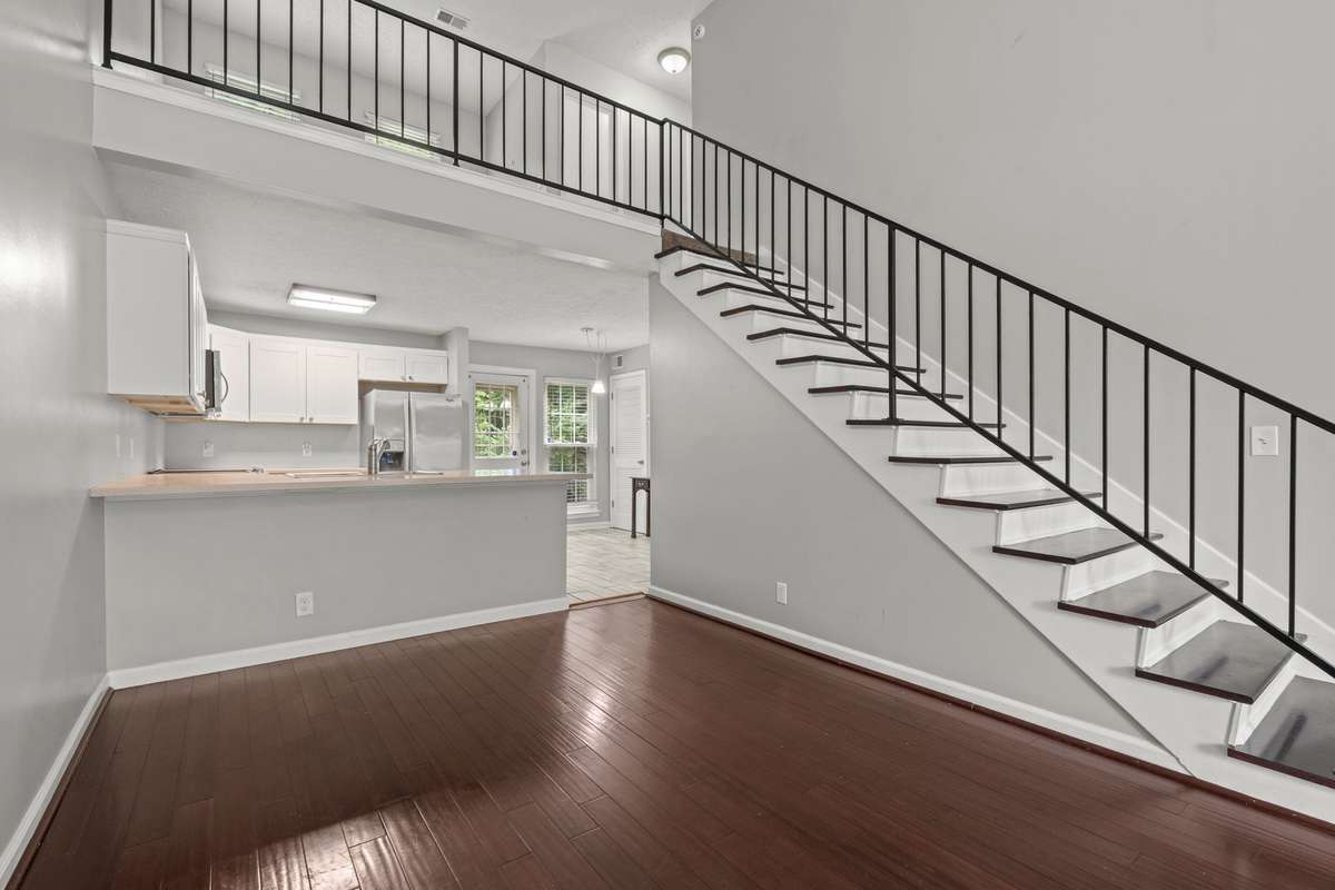 Beautiful 2 bed/ 2 bath townhome in a convenient location close to shopping and restaurants. Completely renovated with sand colored countertops and new cabinets with gold accents. Hardwood floors on main floor make a statement when you walk in the door! Two story living space with loft and tons of natural light. High vaulted ceilings in the living area add ambiance and a much larger feel for the area. Imagine using this loft as your home office or maybe bonus space! Has decidated driveway with ample parking. All stainless steel appliances remain as well as the washer and dryer. Wood blinds on every window remain. Backs up to wooded area for privacy. And the $ 60 HOA fee includes lawn maintainence and trash pickup!