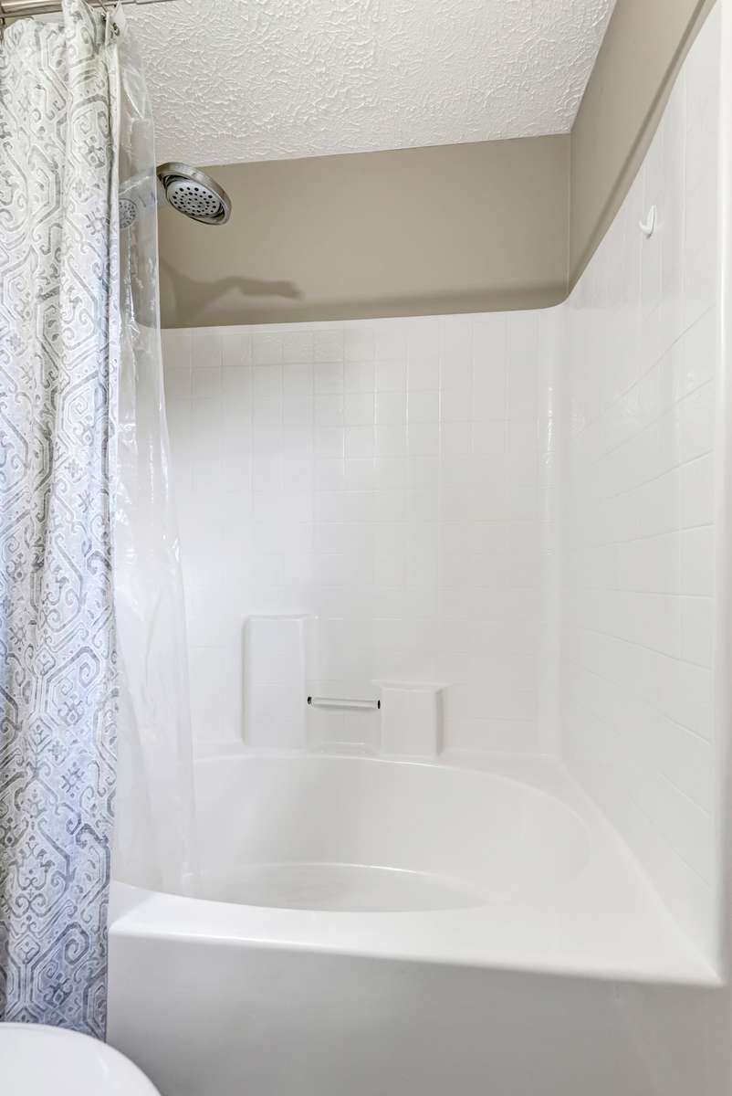 Primary bedroom bath features multifunction showerhead and spacious built-in alcove tub.