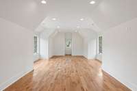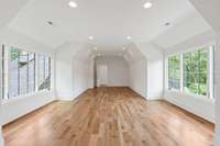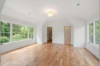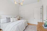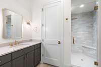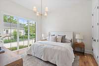 Inside, you’ll find designer finishes, Signature Hardware fixtures, and a turnkey interior ready to impress. The chef’s kitchen is outfitted with Miele and KitchenAid appliances, a marble island, and an open layout that flows beautifully into the living and dining spaces. Enjoy the luxury of two primary suites on the main floor, ideal for multigenerational living or hosting guests in comfort and style. Soaring floor- to- ceiling windows and a spectacular arched front door flood the home with natural light, offering serene views of the lush landscaping and pool beyond.