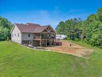 Step outside to an expansive covered deck with vaulted ceilings and recessed lighting, ideal for entertaining or enjoying peaceful evenings. The home showcases fine craftsmanship, featuring custom wood cabinetry and intricate millwork with wide hallways. A large laundry and mudroom area adds to the convenience and functionality of this home. The hardwood stairs also lead up to a bonus room and down to the walkout basement with additional rooms and a den. Poured concrete foundation walls. Water filter. The property is a haven for outdoor enthusiasts, complete with multiple outbuildings, a garden shed, and a thriving garden spot. Savor the fruits of your orchard with 3 peach trees, 5 apple trees, 3 pear trees, and 2 elderberry trees, alongside a small vineyard featuring Concord grapes and muscadines. Trail leading to an out- of- sight outbuilding. Electric RV hookup. With no HOA restrictions, this property provides the freedom to create your dream lifestyle. Nice level road frontage spot for business- minded folks. Embrace country living with modern comforts in this home, perfect for those seeking space, privacy, and natural beauty.