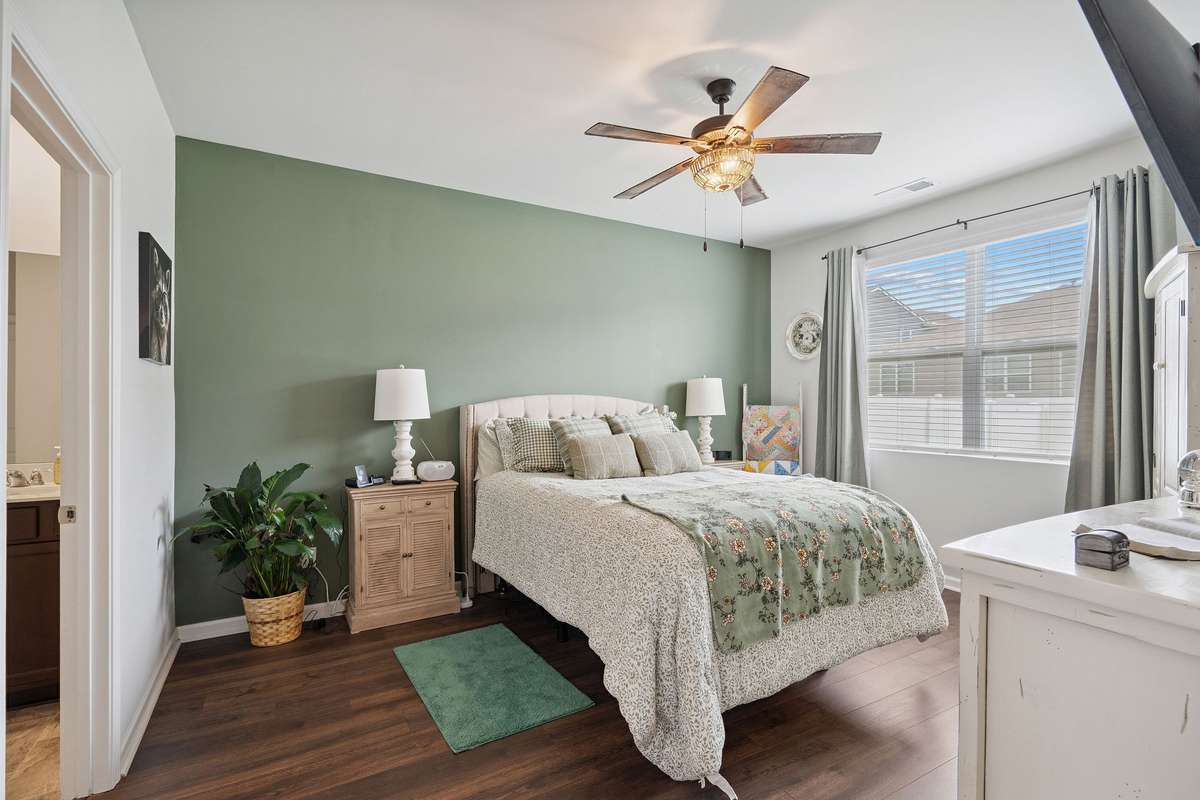 The master suite includes hardwood flooring, separate closets, and a private en- suite bath.