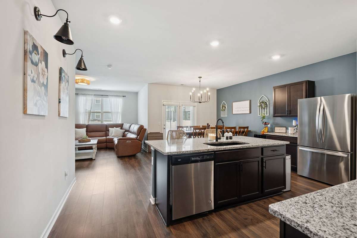 The kitchen is designed as a social focal point, featuring granite countertops, a large island, stainless steel appliances, and a gas stove.