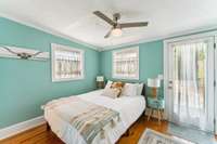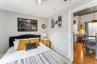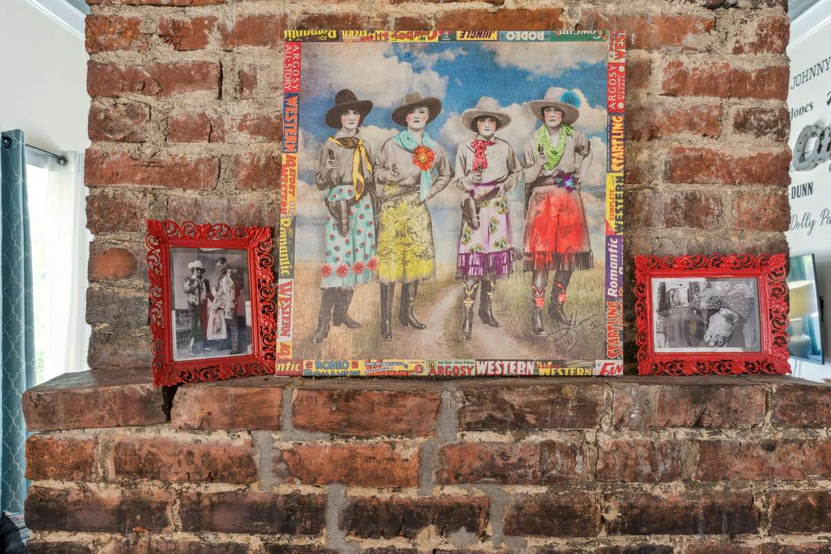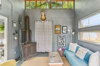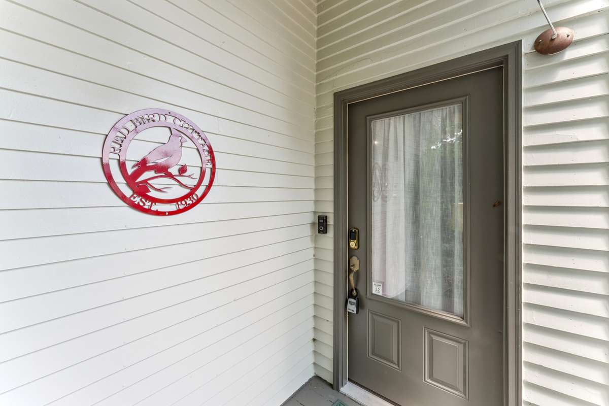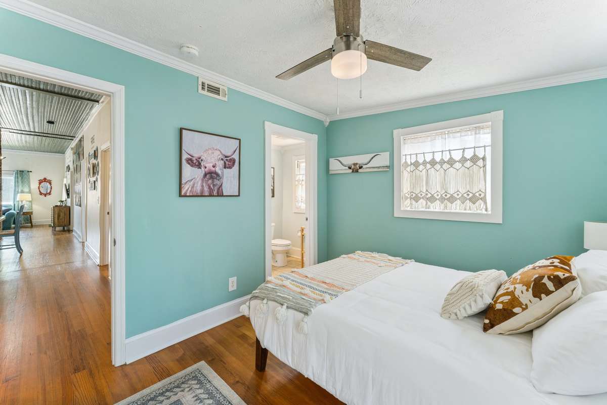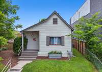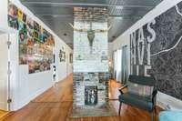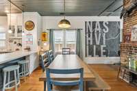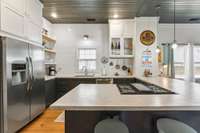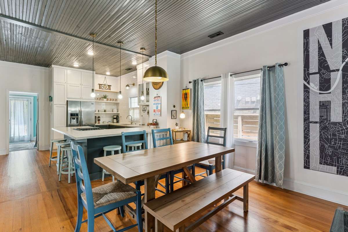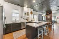 Inside, you’ll find original hardwoods, exposed wood ceilings, and a charming brick fireplace that celebrate the home’s historic roots, complemented by thoughtful modern touches like custom floor- to- ceiling kitchen cabinetry and sleek concrete countertops.