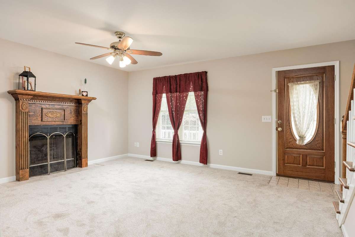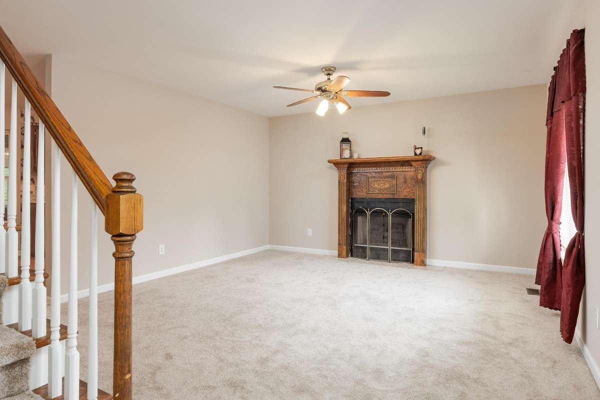 Step into the living room featuring a gas fireplace, perfect for relaxing evenings. The kitchen offers warm oak cabinetry, ample counter space, and the refrigerator stays!