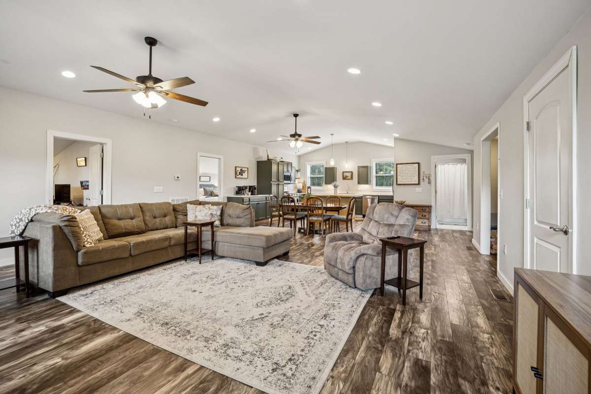 BACK ON THE MARKET due to the Buyers home did not sell. Private home on 17. 59 acres - Perfect getaway for the family! Enjoy the private drive as you pass the Cumberland River, go past the old barn ( old home torn down) and as you turn the corner - you see this 1600sf home with a 3 car garage ( also 1600sf) ready for your fishing boat and RVs. Built in 2020, this open concept is beautifully laid out with a gas fireplace. The room marked as an office space is currently being used as a 3rd bedroom. One bathroom and laundry room are in the garage. Enjoy grilling out on the covered porch then move on to the screened in area to enjoy the evening ( added on in 2023) . The siding and the roof are tin material. This truly is a beautiful setting and less than an hour from Nashville airport. You have to see this one! Perfect place for a B& B.