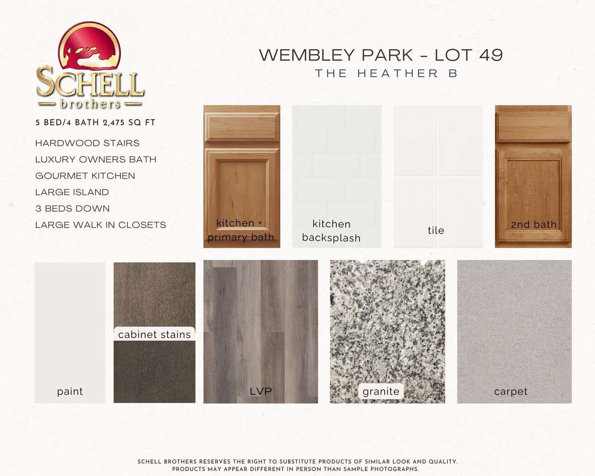 Welcome to the Heather floorplan by Schell Brothers in Wembley Park. This open floorplan features a spacious great room and dining room, a Gourmet kitchen, with an oversized island, gas cooktop, wall oven, all GE appliances - and refrigerator included! This home has an Owners suite downstairs, with a tray ceiling, double owners walk in closets, and a luxury owner' s en- suite bathroom - featuring a large walk- in shower, linen closet and double sink vanity. Laundry, a powder bath and a mudroom, and 2 more bedrooms on the main level make this floorplan extremely versatile for any family.