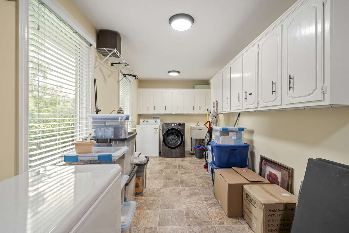Large Laundry Room 23x7 with sink and ample cabinet storage overlooking the front yard.