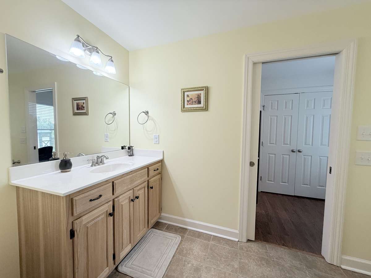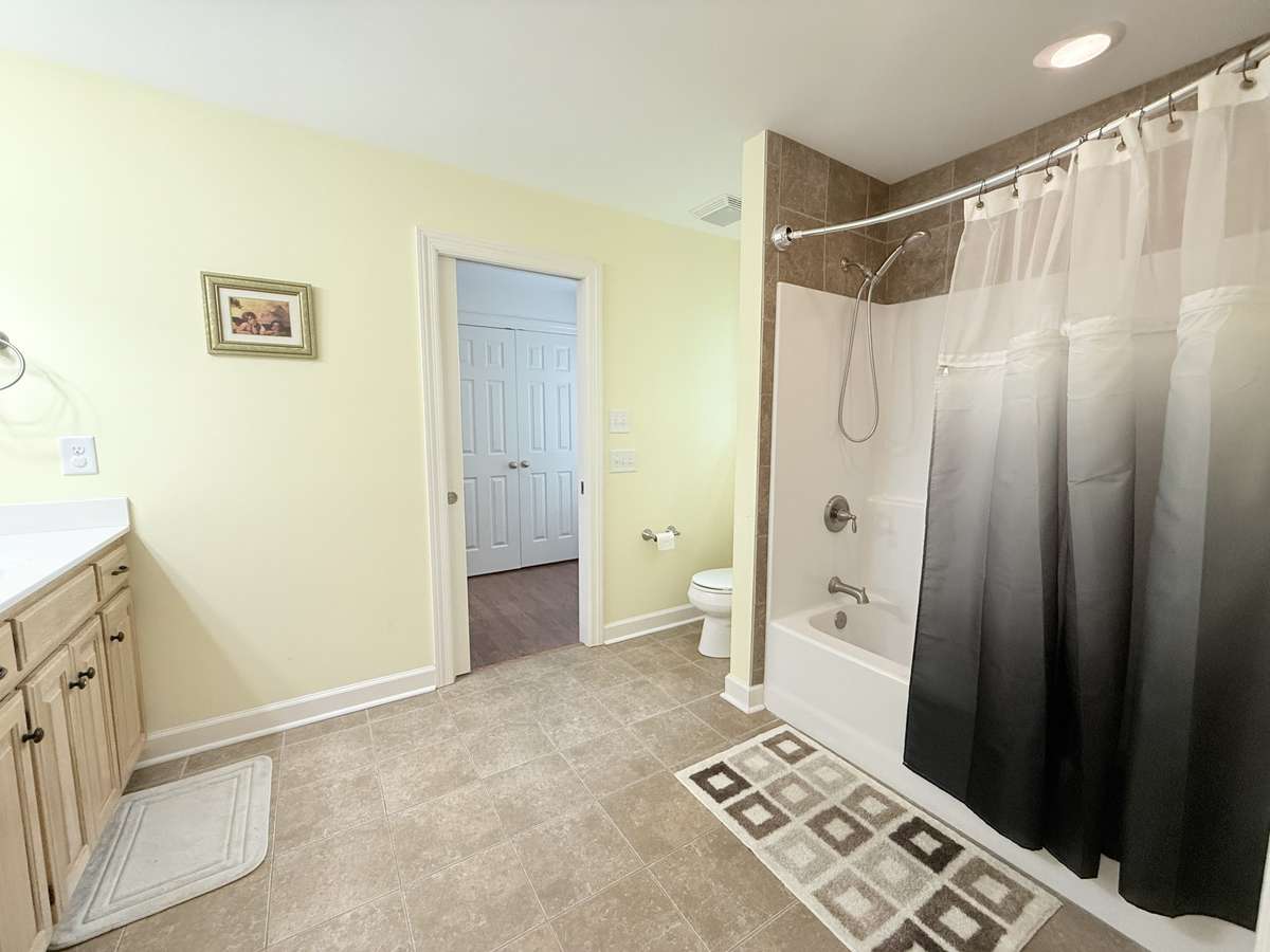 Jack & Jill bathroom with custom vanity tub/shower combo with tile flooring; Flowing into Bedrooms 2 & 3