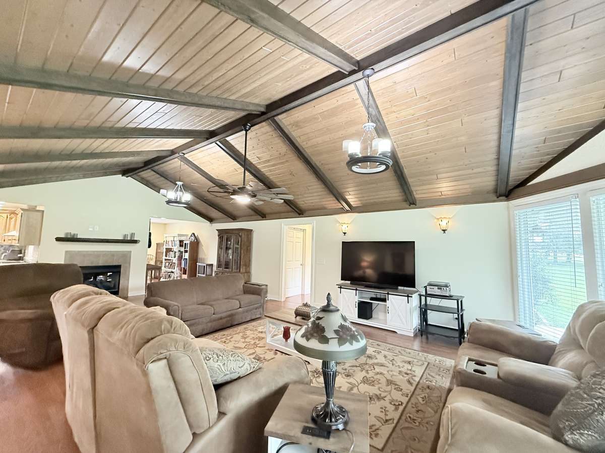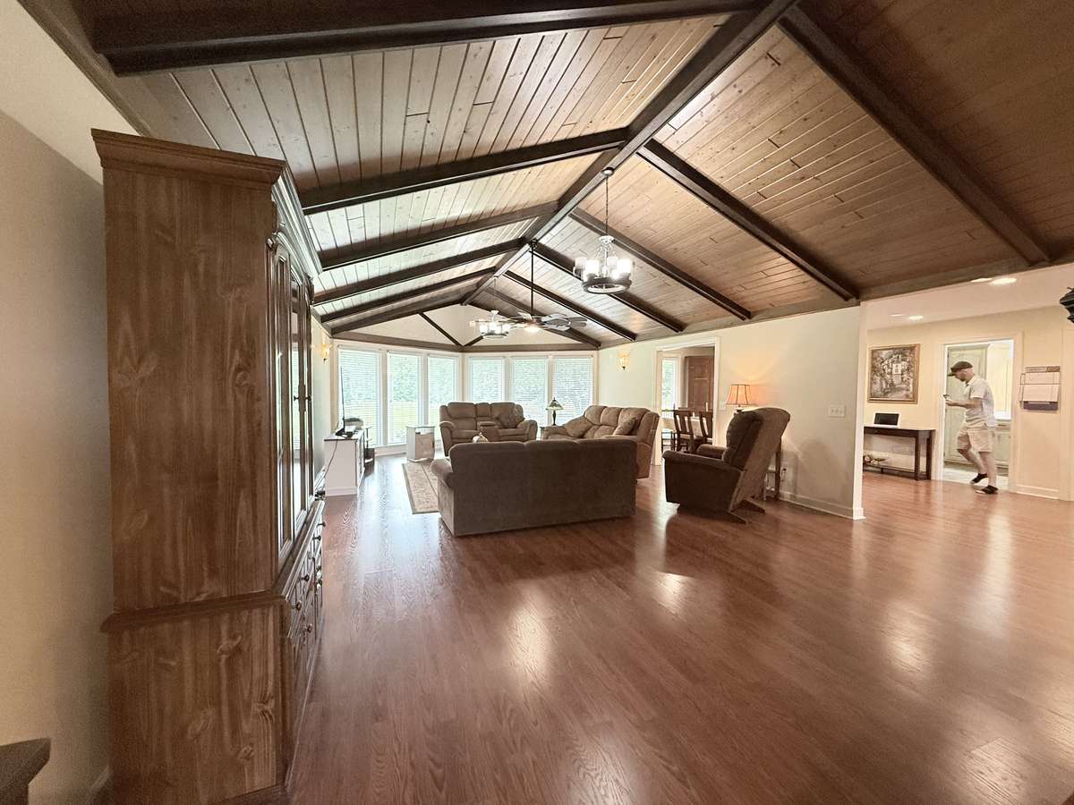 Wood Plank with wood beams in the vaulted ceiling in Living Room
