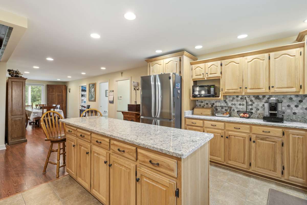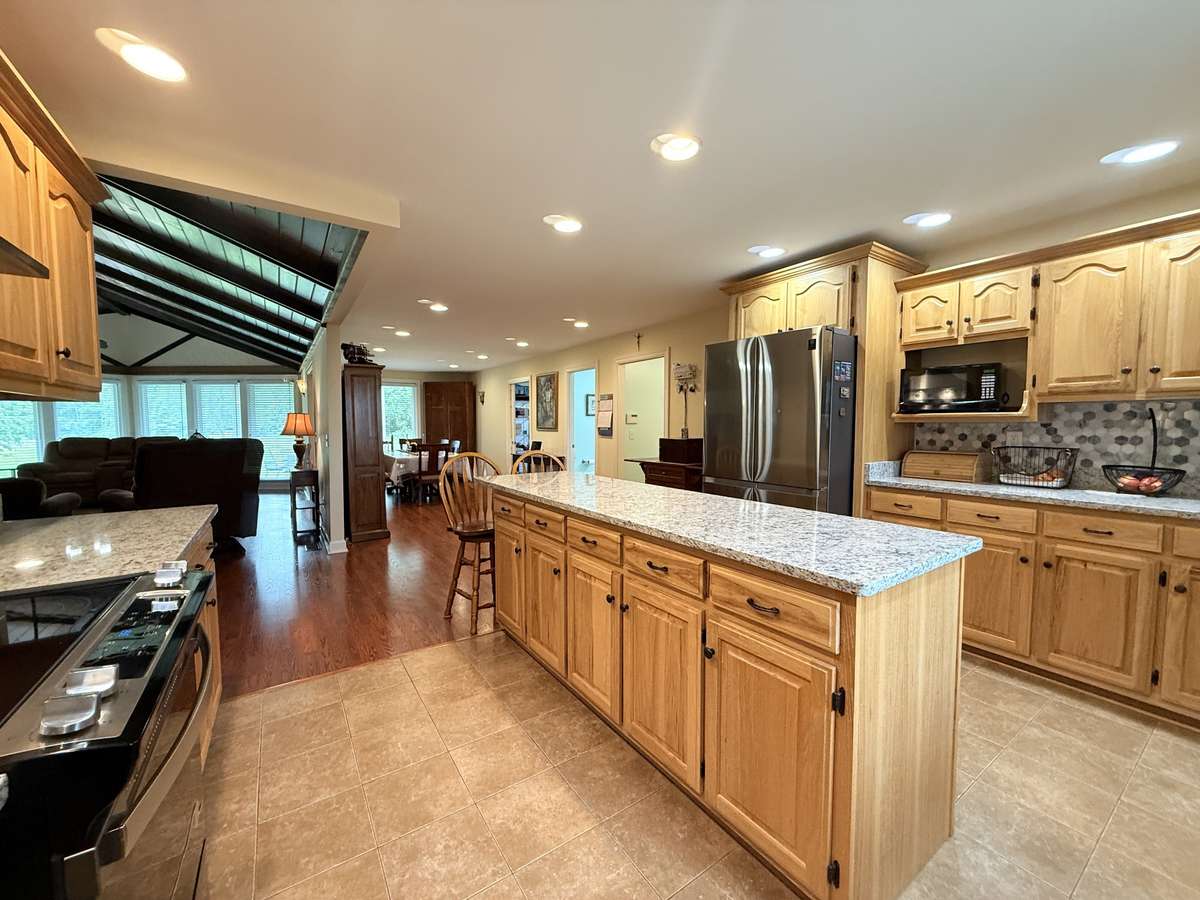 Updated kitchen with granite countertops and tile backsplash with ample custom cabinets with crown molding; Large island w/ lots of storage; recessed lighting; SS appliances; tile flooring meets hardwood flooring into the Dining Room & Living Room