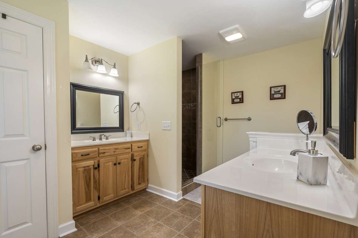 Primary Bath is tile flooring with tile shower; Double custom vanities;