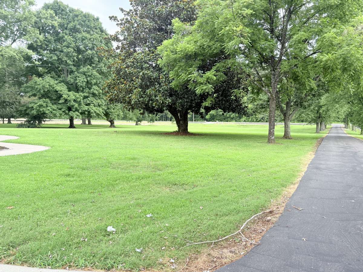 Paved driveway is lined with mature trees;