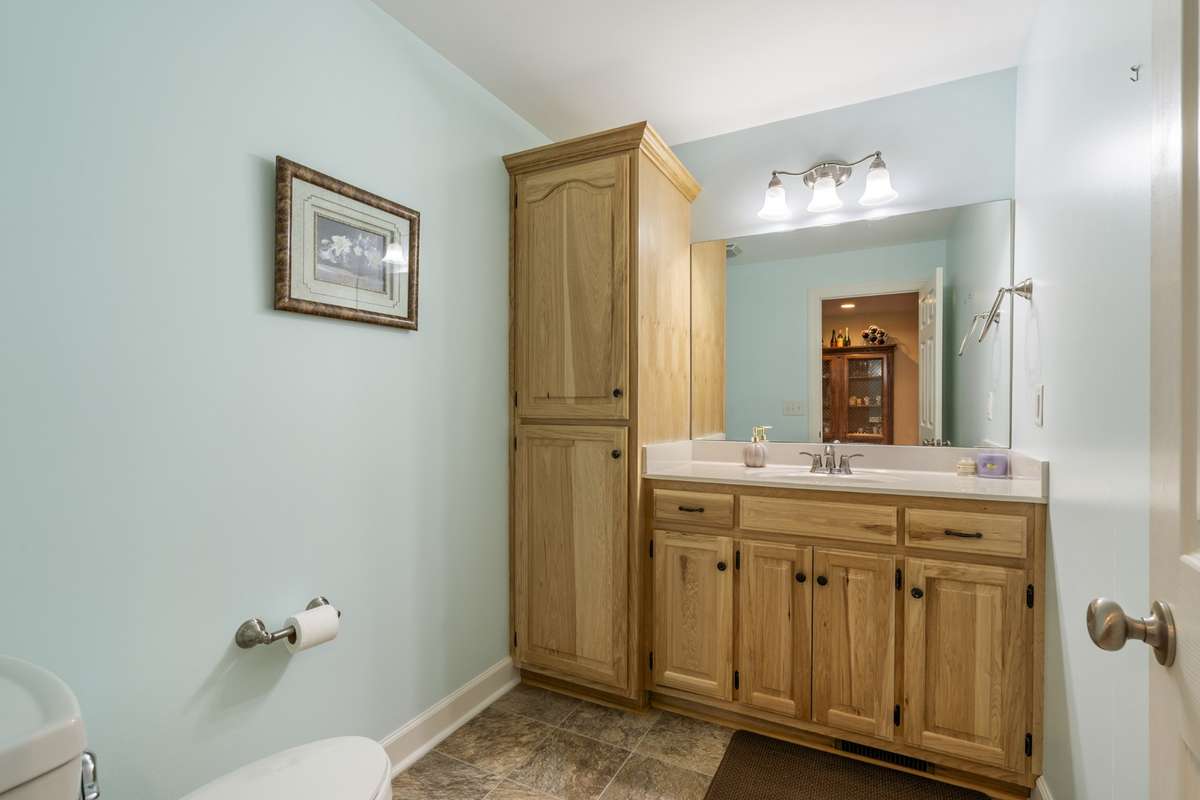 Half Bath with custom cabinets and tower with marble vanity; Flows from Kitchen/Dining Room