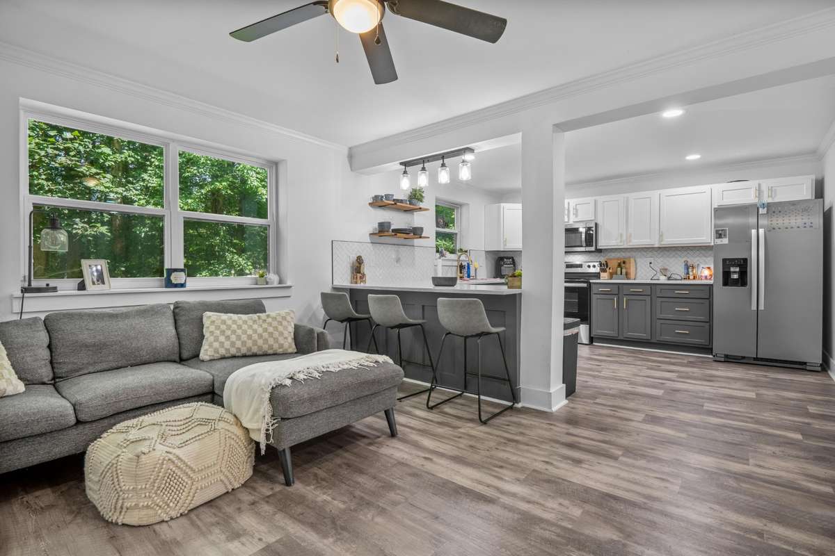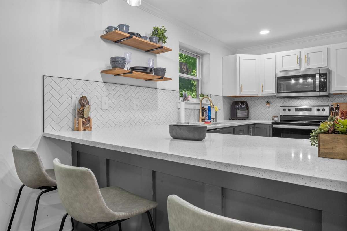 Designer Kitchen: The remodeled kitchen is the heart of the home, featuring updated cabinetry, sleek countertops, tile backsplash, and modern appliances—perfect for everyday meals or entertaining guests.