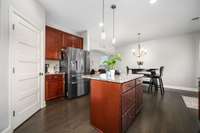 Step inside to an inviting open- concept main level featuring a large living room, formal dining area, and a gourmet kitchen complete with granite countertops, rich wood cabinetry, stainless steel appliances, a center island, and a walk- in pantry. Hardwood floors and recessed lighting complement the warm, neutral tones throughout.