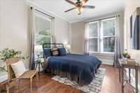 The main level hosts the Master Bedroom, featuring two closets, alongside another private bedroom. Both bathrooms on this floor have been tastefully updated to offer modern comforts. Ascending to the second level, you' ll find a spacious bedroom and a versatile bonus room or office with balcony, providing the ideal setting for work, study, or creative pursuits like painting your next masterpiece.